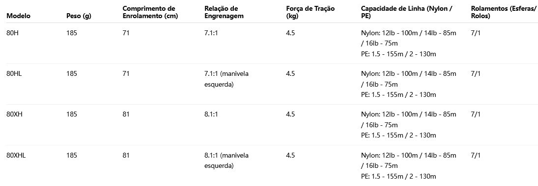 Possui recolhimento de 81 cm por volta da manivela, perfeito para ações rápidas com iscas como frogs, jerkbaits ou soft baits. A força de tração de 4,5 kg garante controle e segurança mesmo ao trabalhar com peixes mais combativos.