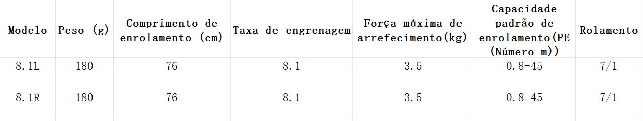Taxa de engrenagem 8.1:1: Uma das mais rápidas na categoria, permitindo recuperar a linha com velocidade impressionante. Essa característica é crucial para reagir a movimentos súbitos de peixes ágeis (como tucunarés, dourados ou pequenos peixes marinhos), evitando que eles encontrem refúgios em vegetação densa ou recortes rochosos. Além disso, facilita a execução de técnicas que requerem ação contínua, como retrieves rápidos com jigs ou crankbaits.