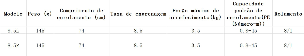Taxa de engrenagem 8.5:1: Uma das mais rápidas na categoria, classificada como "ultra high speed". Essa taxa permite recuperar a linha com velocidade impressionante, fundamental para reagir instantaneamente a movimentos de peixes ágeis (como tucunarés, peixes marinhos de médio porte ou espécies de água doce com comportamento agressivo), evitando que eles escapar em vegetação densa ou rochas. Perfeita para técnicas com retrieves rápidos, como jigs, crankbaits ou iscas de surface.