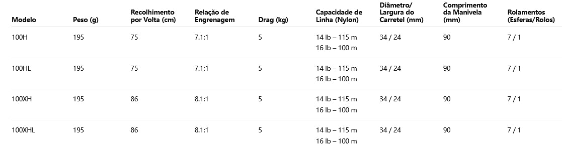 Rolamentos: 7 + 1 (esferas/roletes) – suavidade e durabilidade.