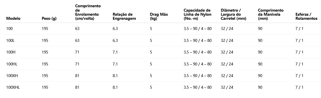 Capacidade de linha (Nylon): 12 lb – 100 m