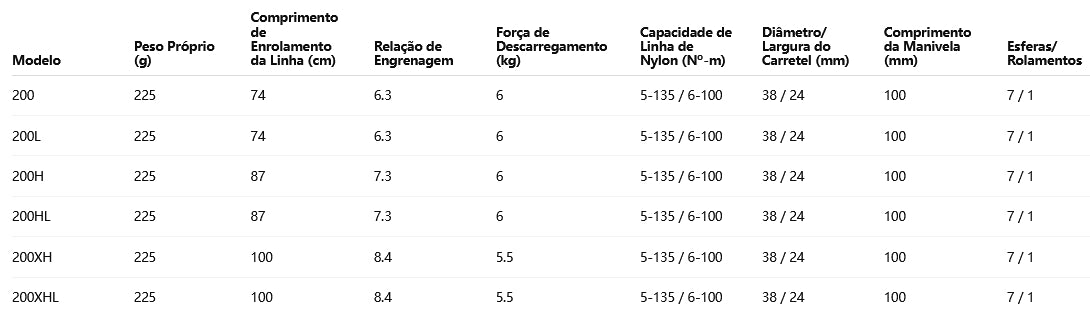 Capacidade de linha (Nylon): 5 – 135 m / 6 – 100 m