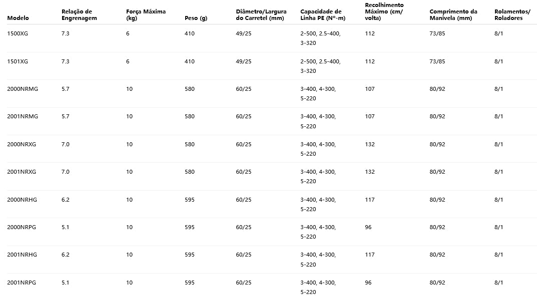 Capacidade de linha PE: PE 3 - 400 m / PE 4 - 300 m / PE 5 - 220 m
