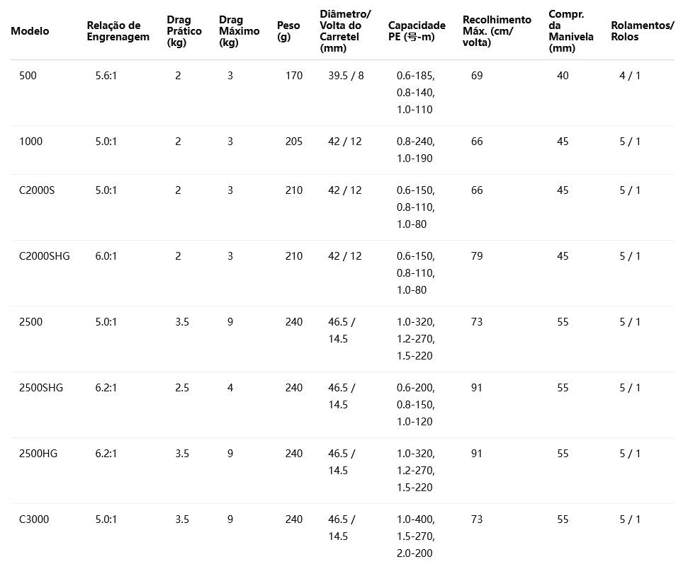 Tamanho 2500: Perfeito para pesca de robalos, traíras, tucunarés e outras espécies de médio porte, com excelente versatilidade entre finesse e potência.