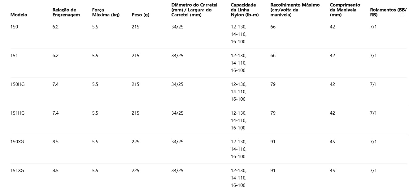 Relação de Recolhimento 8.5:1 (XG) – extremamente rápida, ideal para técnicas que exigem velocidade e eficiência.