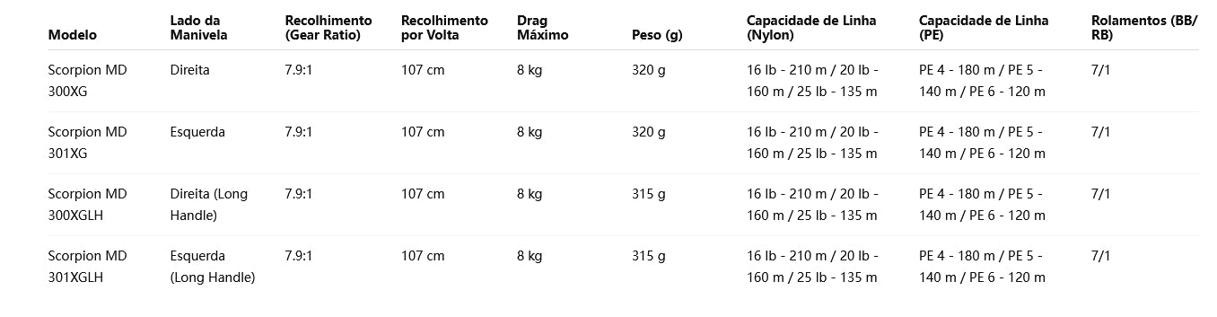 A Scorpion MD 300XG é uma carretilha de perfil baixo da linha 2021 da Shimano, projetada para pescadores que buscam velocidade e potência na hora da briga com peixes grandes. Com uma relação de recolhimento alta, essa carretilha garante agilidade no trabalho das iscas e eficiência na recuperação da linha.