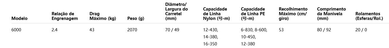 Incrível força de arrasto (drag) de até 30 kg — uma das mais altas da categoria, ideal para capturas extremas como atuns gigantes, garoupas e peixes de profundidade.