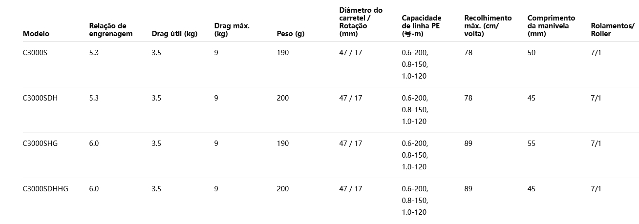 Capacidade de linha PE: 0.6-200 m, 0.8-150 m, 1.0-120 m