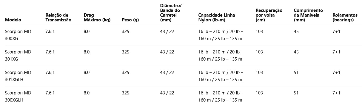 A Scorpion MD 300XGLH é uma carretilha baitcasting de alta capacidade, projetada para pescarias pesadas com iscas grandes (Big Baits) e espécies fortes como tucunaré-açu, dourado, traíra gigante e robalos. Com manivela longa (51 mm), oferece maior torque e controle nas brigas mais exigentes.