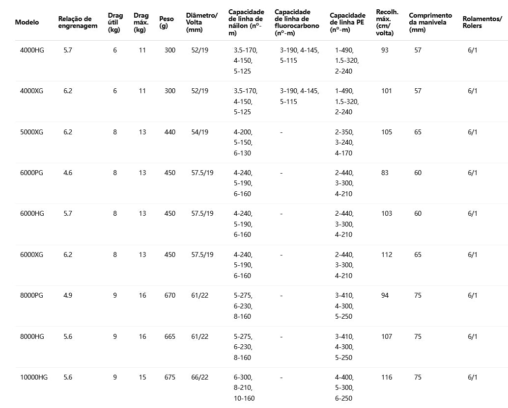 Relação de recolhimento: 4.9:1 (Power Gear – mais torque, recolhimento mais lento)