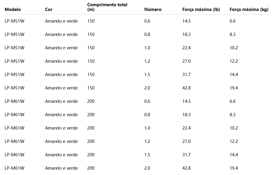 Cor verde (Green): excelente camuflagem na água, tornando a linha praticamente invisível para os peixes.