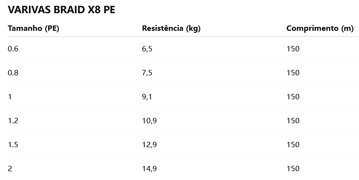 A linha de pesca Varivas Braid X8 PE 1.0# oferece alta resistência e durabilidade, ideal para pescarias que exigem maior força na linha. Com 150 metros de comprimento e cores variadas, facilita o controle e monitoramento durante a pescaria.